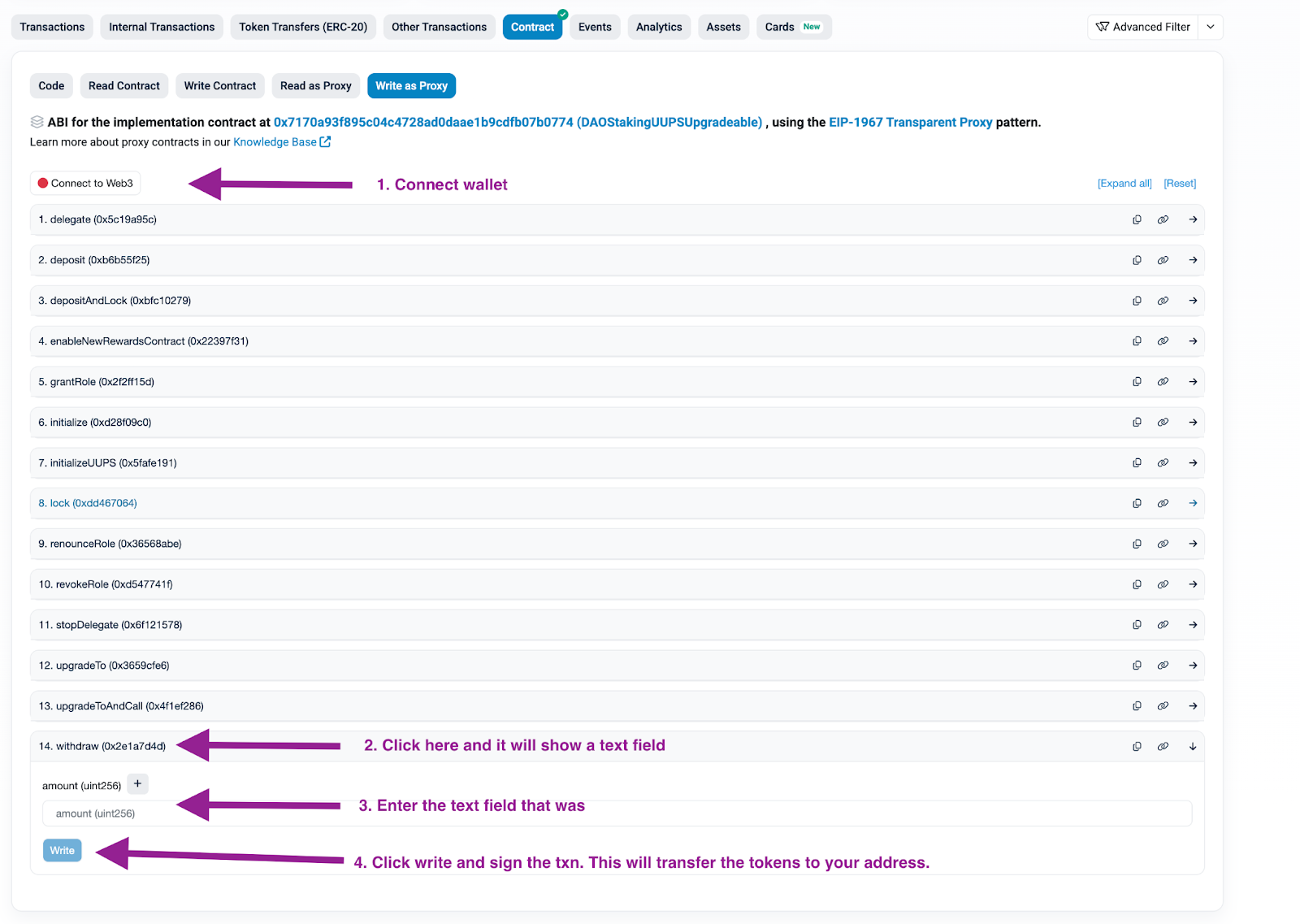 3. Go to https://etherscan.io/address/0x653bFa3661c96eA7d5eeCBE2bf6CC0AA49c610d3#writeProxyContract